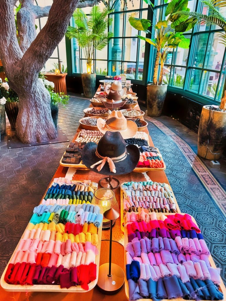 | After-party in a ballroom | Rancher and cowboy hats with a broad accessory library | Strong visual impact across a large room, high perceived value | Groups rotate through together, compare designs, then take photos on the floor |